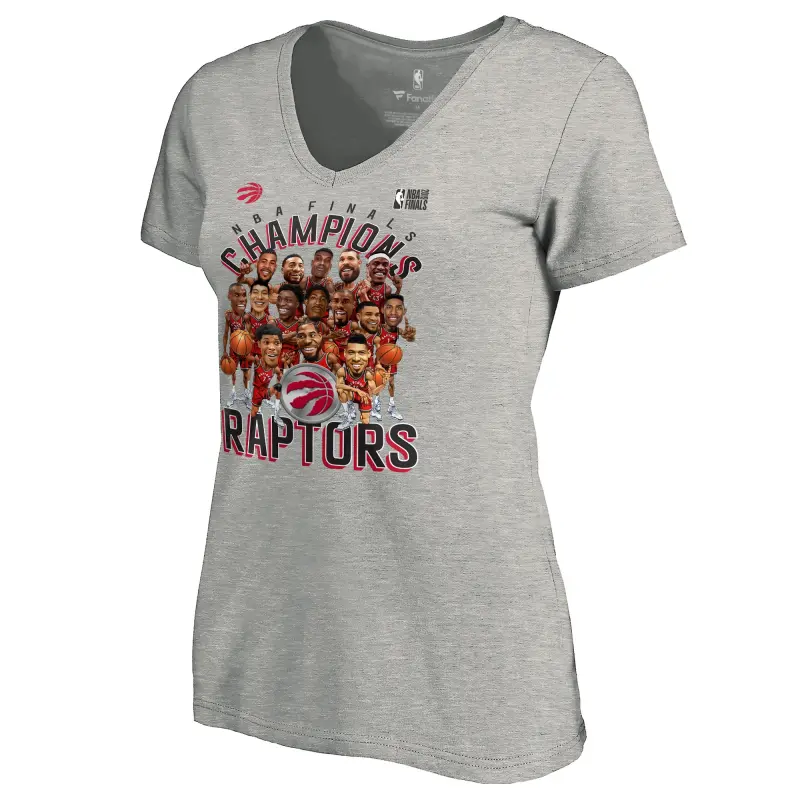 Women’s Toronto Raptors Fanatics Heather Charcoal 2019 NBA Finals Champions Caricature Roster V-Neck T-Shirt
